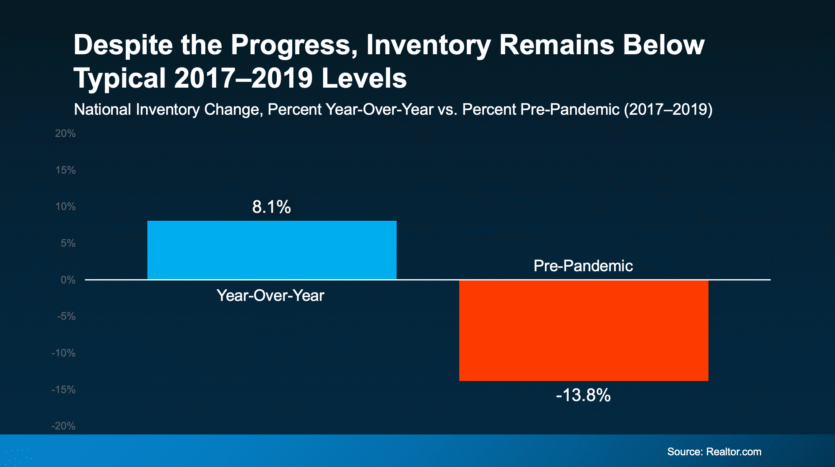 Data from Realtor.com proves that, even though inventory is up compared to last year, it’s still nearly 14% lower than it was during the last normal housing market (2017-2019):