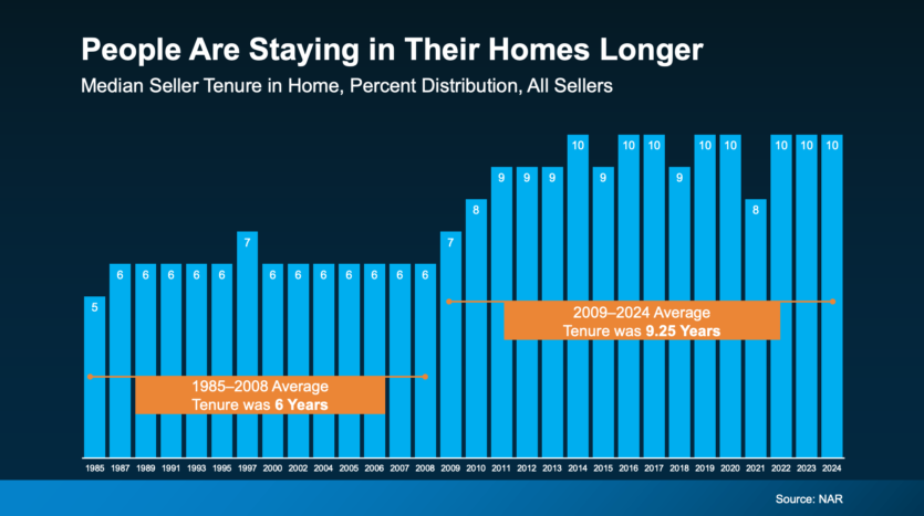 2. People Are Living in Their Homes Longer. Data from the National Association of Realtors (NAR), shows the average homeowner stays in their home for about 10 years now (see graph below):