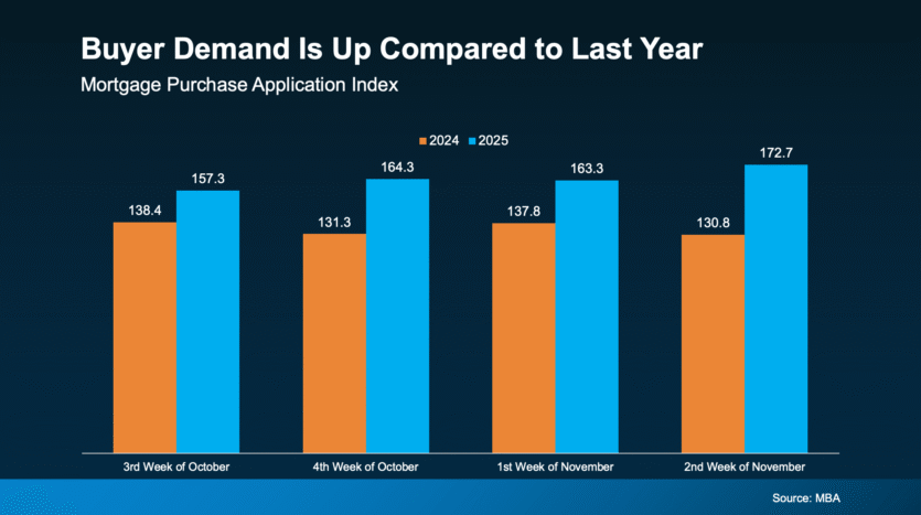 And it’s not just sellers making moves. With more options and slightly better affordability, buyers are getting back in the game, too. The Mortgage Bankers Association (MBA) reports purchase applications are up compared to last year, a clear signal that demand is building again (see graph below):