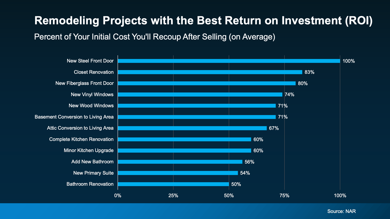 Here’s a quick rundown of the projects with the best potential to recoup your costs according to NAR (see graph below). While it’s a good starting point, just remember it can’t match the expertise an agent can provide.