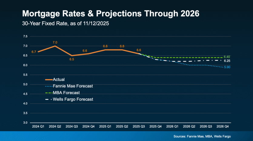 For starters, most experts say mortgage rates are likely to stay pretty much where we are today throughout 2026. So, there’s no guarantee we’ll see a rate much lower than what we have now. Only one expert forecaster is saying rates could fall into the upper 5s next year (see graph below):